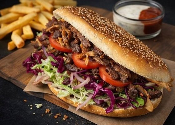 mięso (170g)/ kapusta/ pomidor/ ogórek/ cebula/ sos