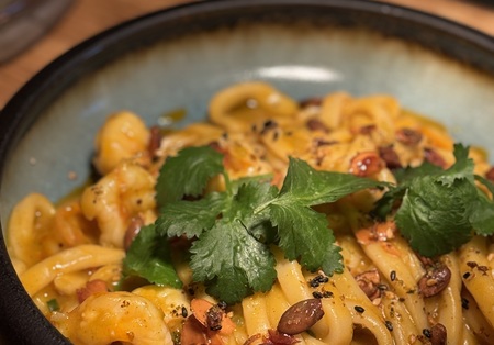 udon 140g / emulsja z pieczonej dyni i curry / krewetki / kolendra/ orzechy / dymka