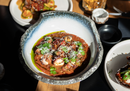 ośmiornica / emulsja z kiszonych warzyw / pancetta / parmezan / orzechy / kolendra / sezam