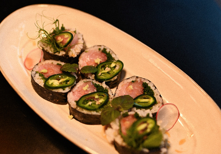 rolka obłożona tuńczykiem / wasabi / serek philadelphia / sriracha / mango / ogórek / szczypior / majonez jalapeno